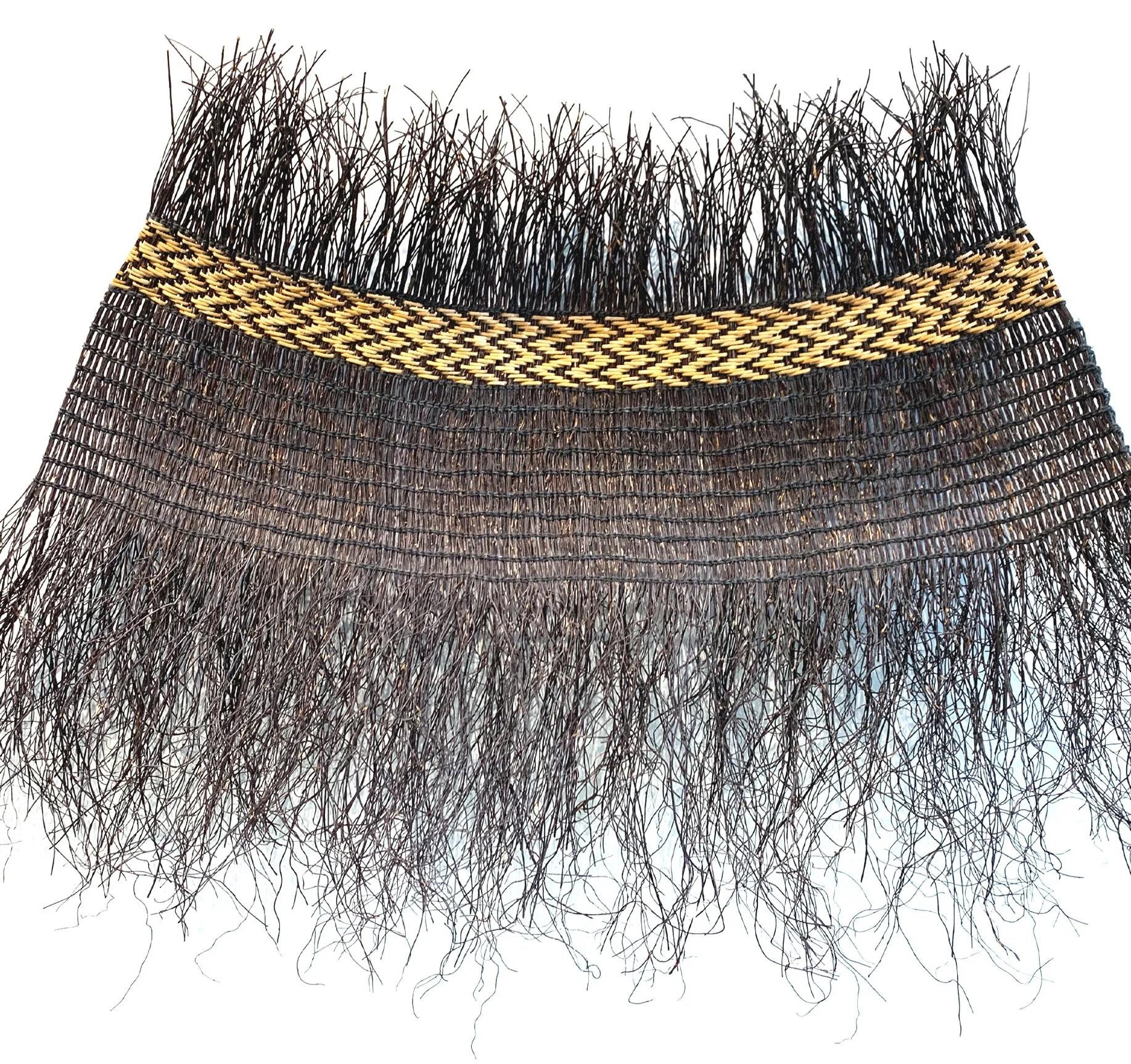 Each leaf contains two strips of strong fibres approximately 6mm wide, these strips were split from the leaves, boiled, rinsed and dried in the sun, bleaching them a creamy white. The strips are pliable, easy to work with, and absorb dyes well. These strips are then woven together to create kete kiekie (woven bag) or used to weave Tūrapa (woven panels). Finley shredded kiekie leaves were also woven with flax fibre to produce Pākē or rain capes.
